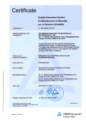 - 公司取得了美國ABS、法國BV、中國CCS、挪威DNVGL、韓國KR、英國LR、日本NK、意大利RINA等全球八大船級社的工廠認證證書,建立了完善的產品質量管理體系。先后獲得了美國API20B資質證書、API6A資質證書、APIQ1體系證書、TPG的NDT認證證書、TPG 熱處理認證證書、歐盟PED等認證證書,同時也通過了一些國際客戶具有高度專業要求的資格認證。